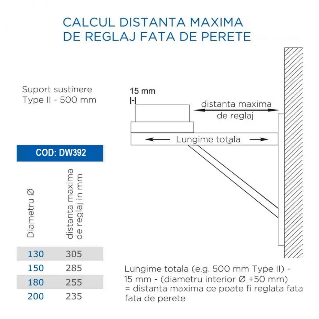 Suportul pentru Suspendarea Coșurilor de Fum DW Black, Type II – 500mm, proiectat pentru a oferi rezistență și susținere durabilă pentru coșurile de fum suspendate pe vertical de peretele clădirii.