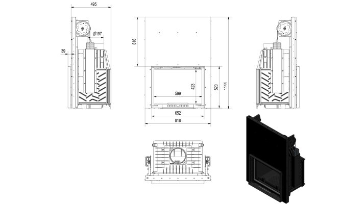 Varianta plus vine cu o ramă de încadrare a ușii cu lățime de 700/515mm pentru o priveliște mai ampla asupra focului. Restul dimensiunilor și caracteristicilor rămânând la fel cu varianta standard.